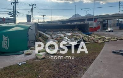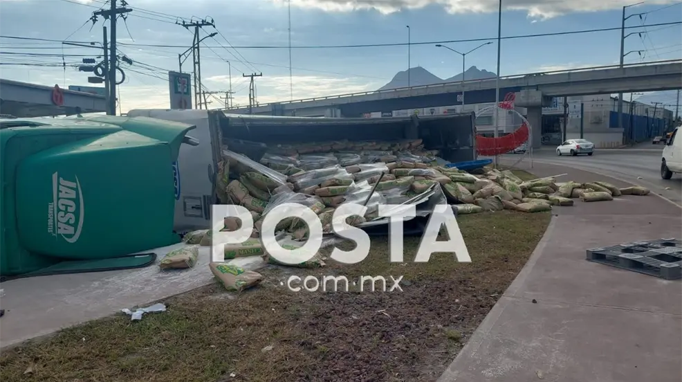 Un tráiler con costales de Maseca volcó en el cruce de las avenidas Nogalar y Los Ángeles, en el municipio de San Nicolás de los Garza.