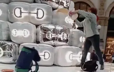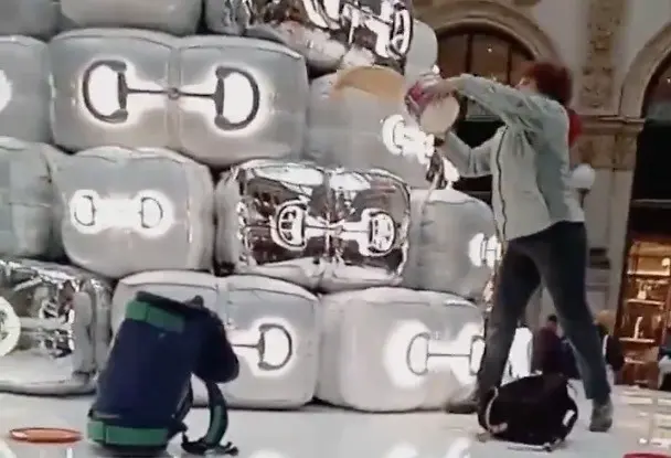 En protesta por la degradación del medio ambiente, activistas climáticos arrojaron pintura naranja al árbol de Navidad instalado por Gucci en Italia.