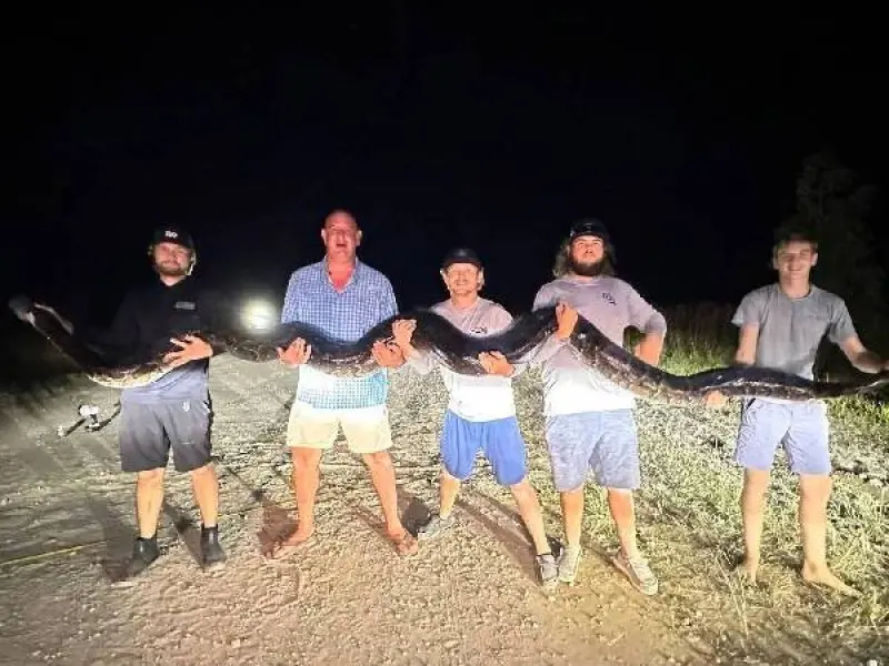 FLORIDA, Estados Unidos.- Un grupo de cinco cazadores de serpientes logró una asombrosa hazaña: capturaron un inmenso ejemplar de pitón de Birmania de 17 pies (5.18 metros) de largo y 198 libras (89.8 kilos) de peso, el segundo más pesado de esta especie invasora capturado oficialmente en Florida, en la Reserva Nacional Big Cypress.