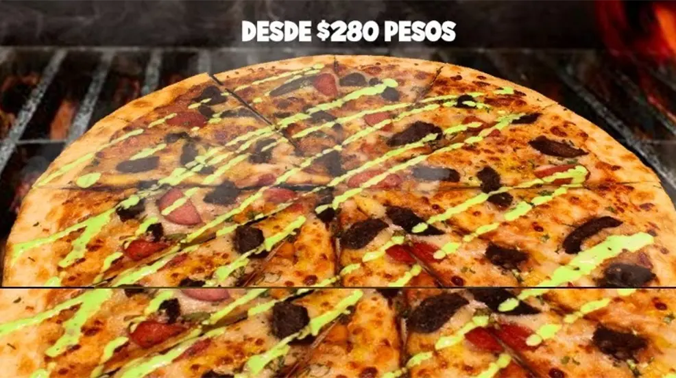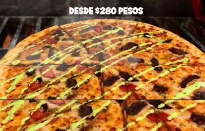 ¿De qué se trata esta delicia? es una pizza de carne asada acompañada de una cama de frijoles refritos, queso mozarella, salchicha polaca y una deliciosa salsa de aguacate y a tan sólo $280 pesos.