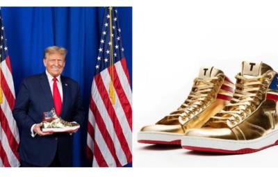 Las zapatillas “para verdaderos patriotas”, de charol color dorado con un detalle de la bandera estadounidense en la parte posterior, se venden como “Never Surrender High-Tops” por 399 dólares en un nuevo sitio web que también ofrece colonia y perfume “Victory47″ de la marca Trump por 99 dólares el frasco.