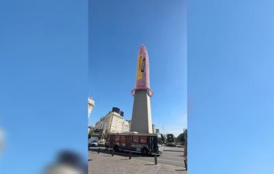 El imponente monumento, ubicado en la Plaza de la República, en Corrientes y 9 de Julio, despertó la curiosidad de habitantes y turistas al amanecer con un condón deslizándose desde la parte superior hasta la base.
