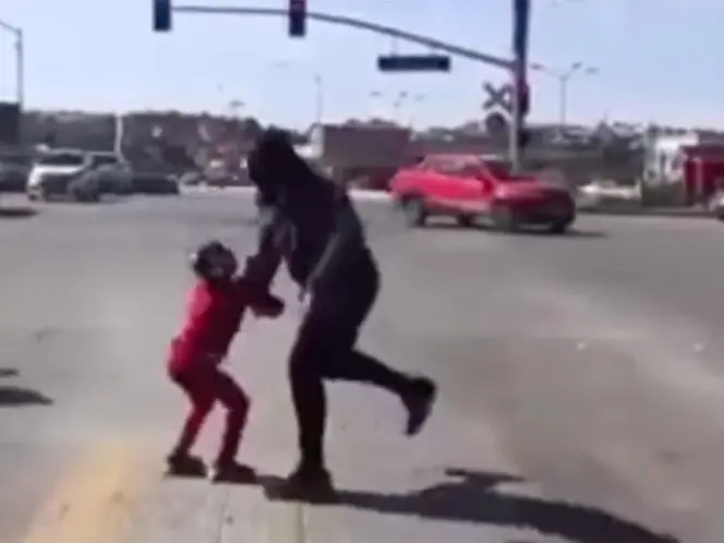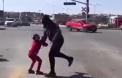 Un niño y su padre causan sensación con una exhibición de lucha libre que dan en un cruce peatonal.