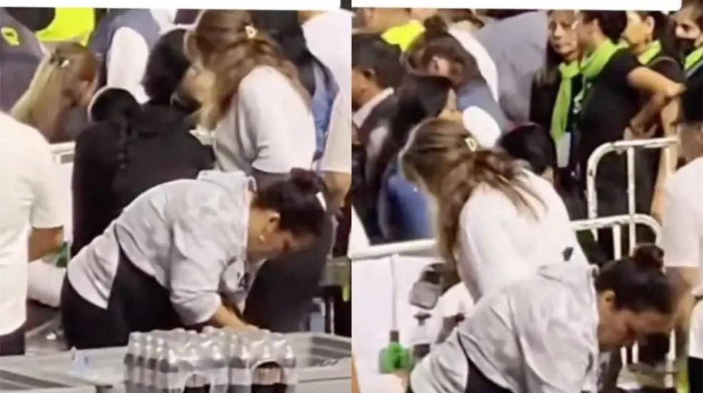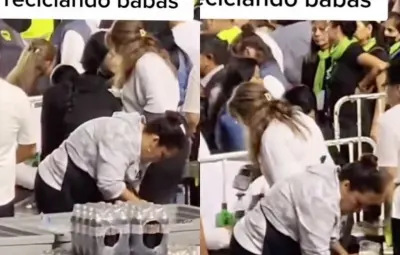 ¡Mira nada más! Llena vendedora de cervezas con sobras los vasos en concierto