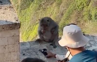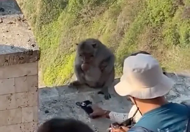En las imágenes se puede ver como un mono en el famoso templo de Uluwatu en Bali, sostiene un teléfono celular mientras una mujer intenta quitárselo para posteriormente persuadirlo ofreciéndole frutas.