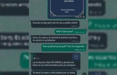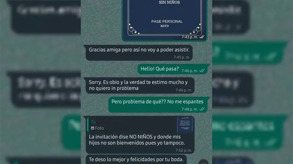 La discusión es un tema que ha sido debatido por años, pero recientemente una captura de WhatsApp ha avivado el problema, pues una mujer envió a una persona a su boda y la invitada se inició e informó que no iría a la fiesta, por que la invitación dice “No niños”.
