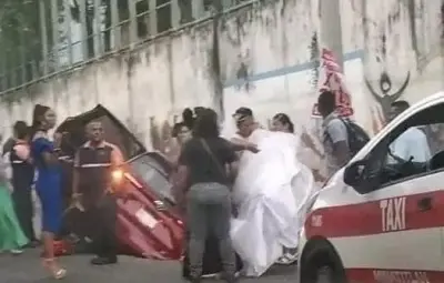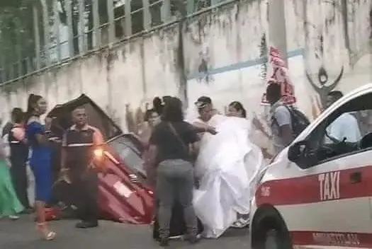 Novia llega a boda en taxi tras caer auto en aguas residuales