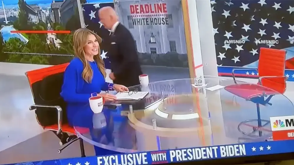 A través de un video que circula en redes sociales, se aprecia cuando el mandatario estadounidense no espera que la producción mande a cortes comerciales y simplemente se para de su asiento para salir por detrás de la presentadora de MSNBC, Nicolle Wallace.
