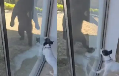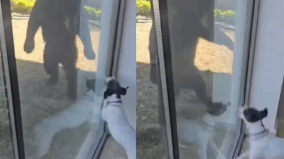Desde una puerta corrediza de cristal, el pequeño ladró con fuerza, mostrando su territorio y exigiendo que el oso se marchara.