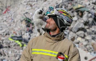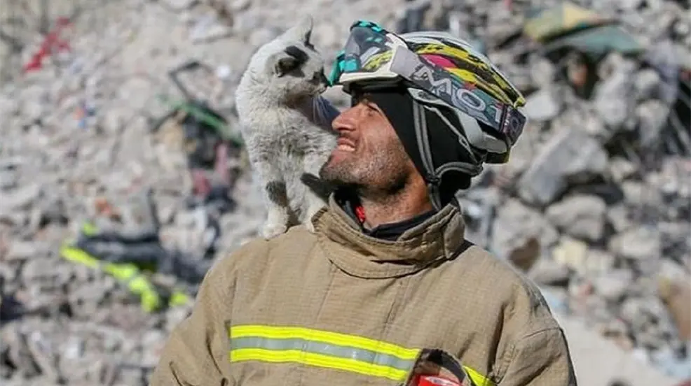 TURQUÍA.- Un brigadista rescató a un gatito bajo los escombros que dejó el terremoto de magnitud 7.8 en Turquía y como muestra de gratitud el felino decidió no separarse de él por lo que se fue a vivir a su casa.