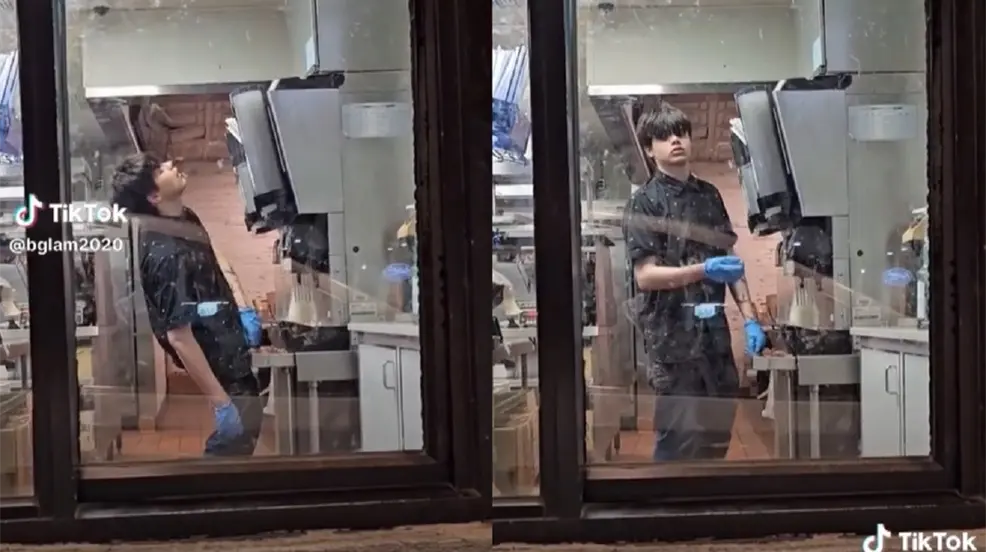 Los hechos fueron captados en video y se puede observar cómo el empleado de Taco Bell se está quedando dormido de pie e incluso golpea su cabeza en varias ocasiones contra uno de los despachadoras de refresco que hay en la cocina. El cliente molesto le toca con fuerzala ventanilla hasta que el joven reacciona y se le aproxima.