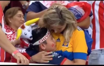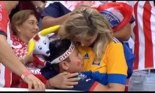 La toma se vio en las pantallas al finalizar el partido de vuelta de la final, se observa a una madre fanática de Tigres, consolar a su hijo aficionado de Chivas, quien no pudo soportar la derrota de su equipo y rompió en llanto en pleno estadio.