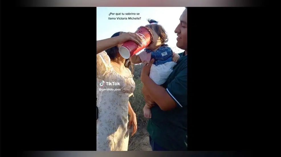 El video compartido por la cuenta @EsdeProfugos, se puede a ver a un hombre cargando a una bebé de mientras una mujer sostiene en su mano una presunta michelada, una vez que la menor observa el vaso, intenta acercarse a el mismo y quien se presume es su madre le comparte un sorbo.