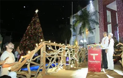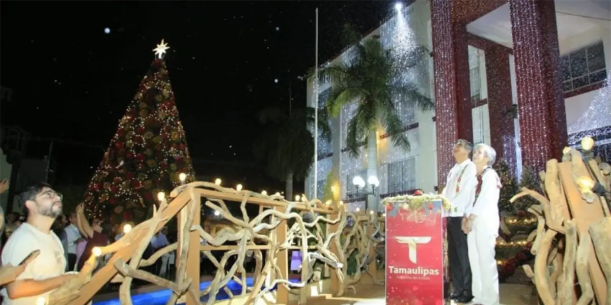 Tamaulipas da la bienvenida a la temporada navideña con el encendido del pino monumental en Plaza Juárez, lleno de luces y música.